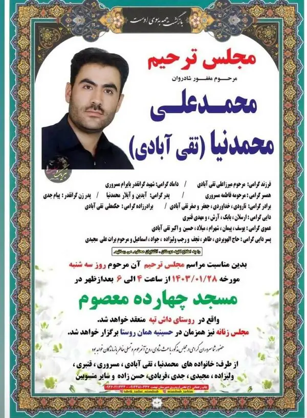 روز بیست هفتم فروردین ۱۴۰۳ بود که خبرهایی مبنی بر وقوع یک زنکشی در شهر میاندوآب واقع در آذربایجان غربی، در شهر پیچید. فاطمه مسرور حدودا چهل ساله، کارمند آموزش و پرورش به دست همسر ۴۹ سالهاش، محمدعلی محمدنیا به قتل رسیده بود و ضارب پس از به قتل رساندن همسرش، خود را با همان اسلحهای که همسرش را کشته بود، به خود شلیک کرد و به زندگی خود پایان داد. علت قتل این بوده که فاطمه مسروری قصد گرفتن طلاق از محمدعلی محمدنیا را داشته. گفتنیست که فاطمه مسروری در کودکی به عقد این مرد درآمده بود و دختری که حاصل ازدواجشان بوده نیز هنوز دبیرستان را تمام نکرده و ازدواج کرده و او هم قربانی کودکهمسریست.